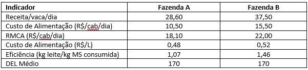 Nas Tabelas 1 e 2, acima, criamos uma situação hipotética comparativa entre 2 fazendas (A e B). Para que possamos fazer uma análise correta precisamos verificar se os indicadores avaliados são, de fato, comparáveis. Sistemas de produção diferentes, com médias de produção diferentes por diferentes motivos como: perfil de rebanho, conforto oferecido, tipo de alimentação fornecida (TMR ou não) e estágio de lactação (DEL = dias em lactação) afetam, significativamente os números e conclusões obtidas. Podemos reparar no exemplo acima que as bases são comparáveis, pois são sistemas semelhantes com animais semelhantes com mesmo DEL médio. A diferença fica por conta do custo de alimentação e do preço recebido, variáveis que são quase sempre diferentes (de fato). Mesmo com um custo de alimentação maior, em função de um investimento maior na alimentação (R$15,50 x R$10,50/cab/dia) e com um menor preço recebido por litro de leite, o RMCA da Fazenda B é melhor do que da Fazenda A. Se analisarmos somente a dieta fornecida, o desembolso do produtor A é menor do que do produtor B, porém este último é mais eficiente. Mesmo com custo de alimentação (R$/L) maior, suas vacas são mais eficientes em termos de conversão. Para cada kg de MS consumida as vacas da Fazenda A produzem 1,07 litros de leite e na Fazenda B (mais eficiente), 1,46 litros. O resultado prático é a maior sobra de recursos para bancar os demais custos de produção. Como são fazendas, teoricamente semelhantes e comparáveis, a conclusão e diagnóstico inicial que chegamos é de que a Fazenda B, possivelmente, tem um melhor manejo de alimentação ou que, simplesmente tem uma dieta mais ajustada, mesmo que mais cara do que a Fazenda A.